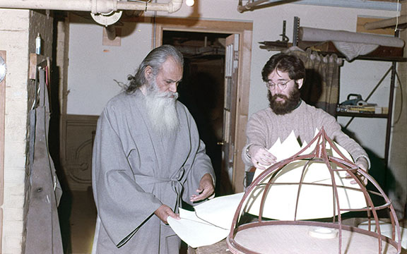 Photo: Asangan working with Gurudev on a LOTUS model, Yogaville East, 1980.